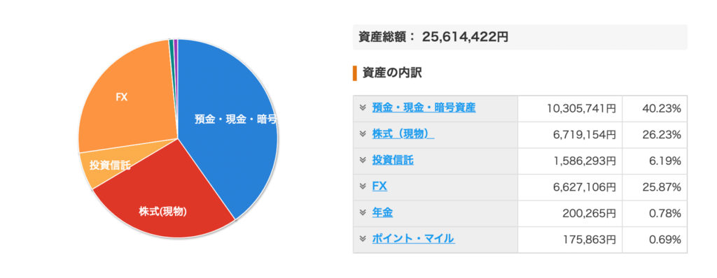 残りは資産運用に回していて、FXが26%、株式(現物)が26%、投資信託が6.2%、年金が0.8%といったポートフォリオになっています。